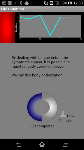 This app will easily calculate your fatigue level. All you need to do is to place your finger on the camera.The degree of fatigue is calculated by using the data of HRV got from the heart rate. The results are displayed as a percentage(%). If you are tired, it also displays simple tips.