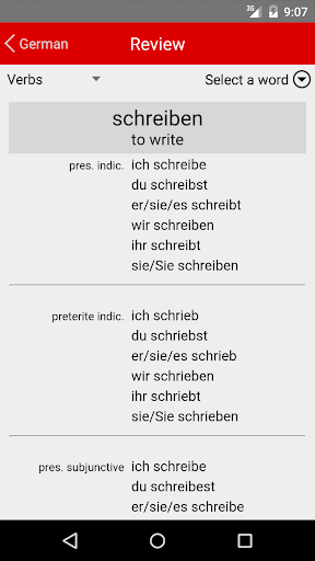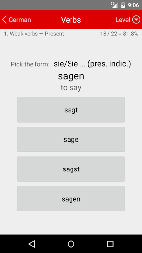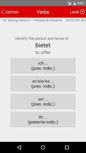 Whenever you have your phone and a free moment, it offers a continuous multiple-choice test on German vocabulary and verb conjugation. Each answer you give is immediately confirmed or corrected, and your knowledge is reinforced by repetition.