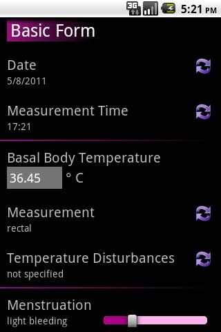 Just enter your basal body temperature and cervical mucus quality. Your current cycle is automatically visualized and your fertility state is always visible on the main page.