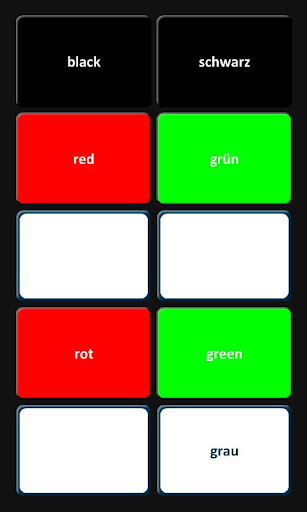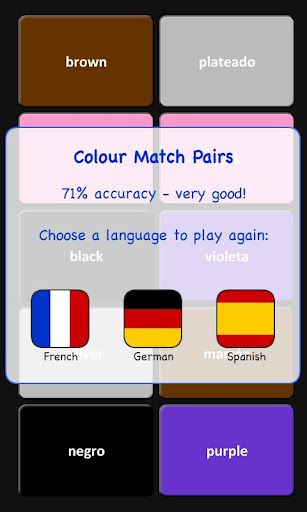 Learning French, German or Spanish as a foreign language? Practise the words for colours with this simple and fun matching game. Click the cards one by one in order to discover matches. When two cards match, they turn the colour indicated by the matching word. Soon you'll be naming colours like an expert!