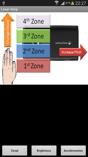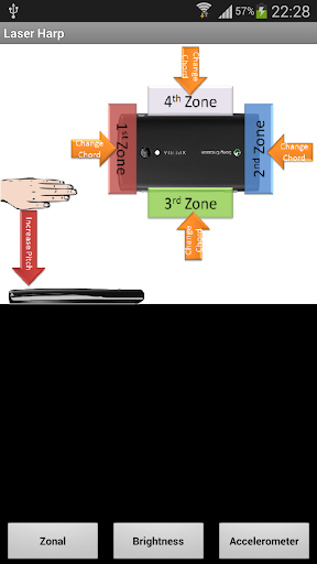 This is a 'Laser Harp' and it turns your phone into a musical instrument that you play by moving your hands in the area above the phone. There are 2 different types of hand control and an accelerometer mode where you simply move the device to change the sound.