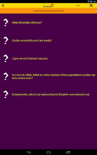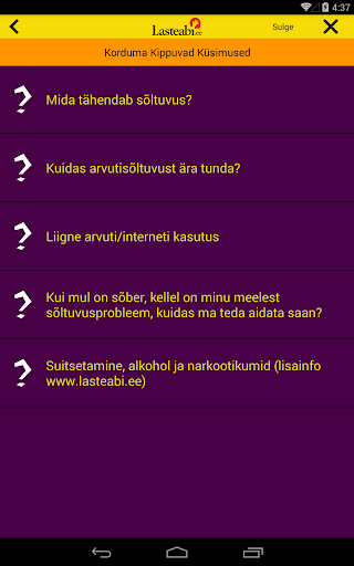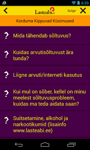 Rubriigis KKK on esindatud ka korduma kippuvad küsimused, millele on juba vastused rakenduses olemas, küsimused on kooli, perekonna, sõltuvushäirete ja palju muu kohta.