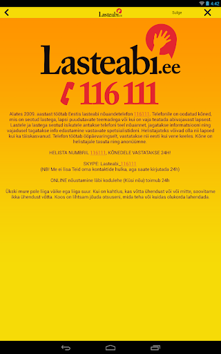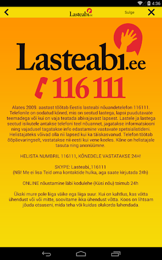Lasteabirakendus on tasuta rakendus, mis on mõeldud nii väikestele kui suurtele, kellel on soovi suhelda lihtsalt ja mugavalt meie nõustajaga läbi interneti. Nõustajad annavad nõuannet, jagavad tarvidusel informatsiooni ning tagavad vajadusel info edastamise vastava spetsialistini. Kirjutada või helistada saab meile ööpäevaringselt ja tasuta. Lasteabirakenduses leiab ka erinevat infot, vastused üldlevinud küsimustele ning vaadata saab ka erinevaid videoid ning multikaid.
