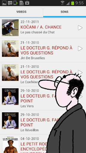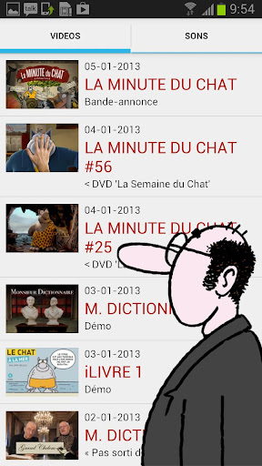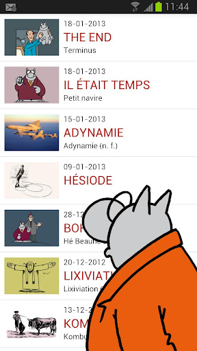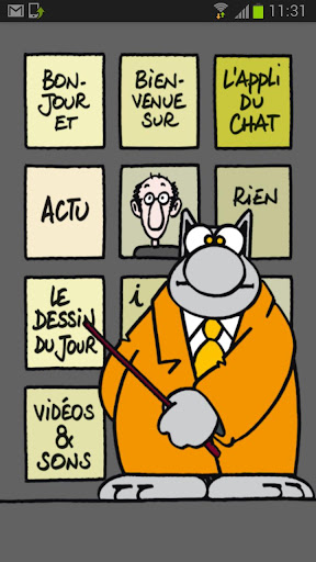 Il s’est fait désirer mais ça y est, Le Chat a débarqué sur Androïd avec une application mise à jour quotidiennement. Lorsque tu l’auras acquise (gratuitement !!), voici ce que tu y trouveras : chaque matin, un gag inédit dessiné par Philippe Geluck rien que pour l’appli (365 dessins par an, c’est l’équivalent de 3 albums papier), 14 dessins en mémoire (soit 2 semaines complètes), des infos & actus aussi rigolotes qu’intéressantes (toujours rédigées par l’auteur), des vidéos diverses, des sons (Docteur G., M. Dictionnaire,...), ainsi qu’une communication geluckienne (face caméra) hebdomadaire.