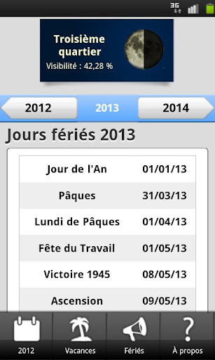Calendriers depuis 1970 et jusqu'en 2037. Toutes les dates de vacances scolaires par zones. Tous les jours fériés et toutes les fêtes à souhaiter. Calendrier solaire et calendrier lunaire. Tout ça gratuitement et de n'importe où grâce à cette application unique !