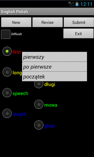 A. Select New, then touch the head word in the left column and it's matching word in the right column. Its colour will change. Repeat this for all words and then select Submit to check the answers