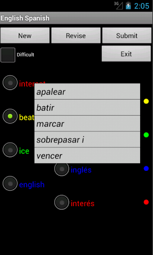 A. Select New, then touch the head word in the left column and it's matching word in the right column. Its colour will change. Repeat this for all words and then select Submit to check the answers