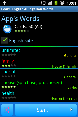 - A szókártyák angol és magyar oldalról is kikérdezhetőek