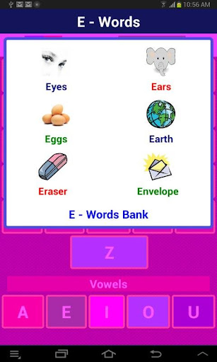 ✔ The app also includes a comprehensive listing of 2-6 letter words, in a feature titled "Words Bank" for each alphabet and provides an interface to "dictionary.com" to get the meaning of any word that kids don't understand.