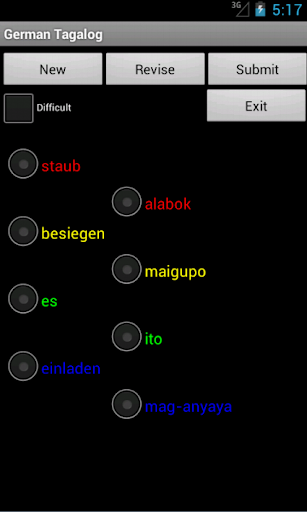 A. Select New, then touch the head word in the left column and it's matching word in the right column. Its colour will change. Repeat this for all words and then select Submit to check the answers