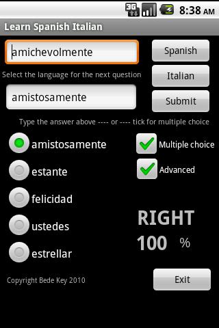 Italian Spanish talking flash card learning game helps to build your vocabulary. Choose either multiple choice or text entry to match a random word. Advanced mode randomizes from the full dictionary, while the standard option selects from the most commonly used words.