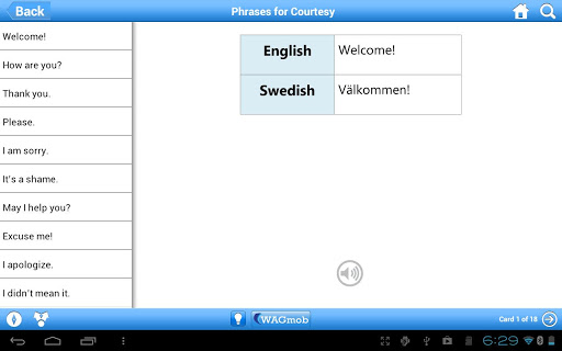 Designed for English Speakers. Tap a phrase and it will be spoken for you in Swedish, anytime, anywhere! Meeting friends and co-workers from Sweden could be much more fun with this app. Focus is on everyday phrases and words.