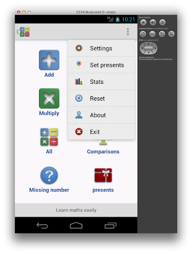 Learn maths easily is an application in English an Spanish that allows children practice basics mathematics operations necessary for further maths domain. The application encourages children by earning points that can be exchanged for gifts that parents can set, according the child's needs and possibilities of each family.