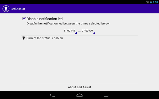 Led Assist lets you choose a time interval during which the notification led of your phone will be disabled.