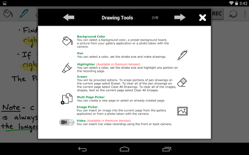 Premium feature includes video recording, additional shapes, highlighter. Many more features will come very soon, including publishing to YouTube.