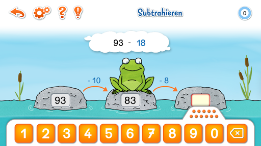 Hilf dem Frosch über den Fluss! Rechne die Subtraktionsaufgabe, indem du die Eingabefelder auf den Steinen schrittweise ausfüllst und so den Frosch sicher ans andere Ufer geleitest.