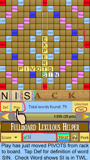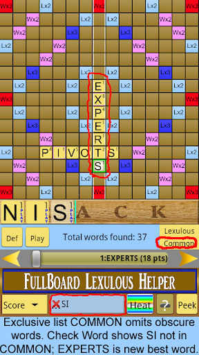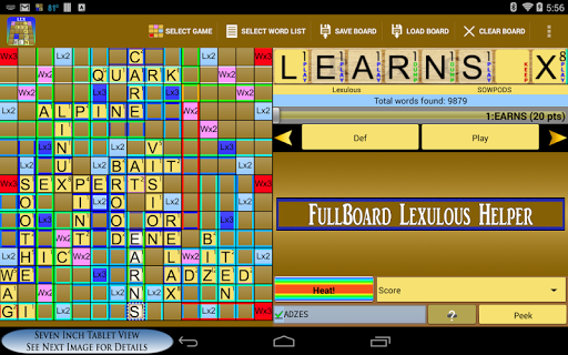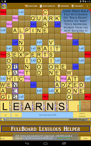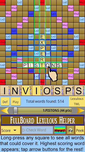 If you cheat, you won't learn, so play each turn on your own, then go to FullBoard, press the Peek button to see THROUGH the helper to your word game, release the button to see the helper again, and tap your game's latest words onto the helper's board and rack using any keyboard you like (soft, slide-out or EXTERNAL). Playable words appear and update on your full game board as if by magic as you are typing - "you don't even have to ask!"℠ The highest-rated word appears first, and you can view additional words without leaving the screen where you entered your letters. It's like having a spreadsheet for words!