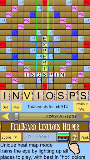 Black box cheat apps can crank out a few high-scoring words, but cheats don't provide any real insight into your game. By contrast, this helper finds and shows, on a full game board, EVERY WORD you could have played from your game's rack, best words first, and then LIGHTS UP the BEST spots "like the eyes of an expert"℠ with its color-coded "Heat Map" feature.
