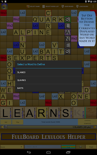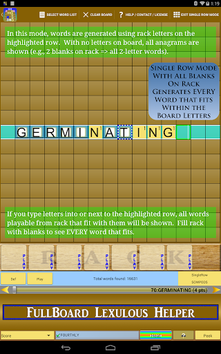 Besides its unmatched ability as a full game board analyst and instructor, FullBoard is loaded with extras. The app's SINGLE ROW word builder finds ANAGRAMs, hook words and more! The CHECK WORD field can tell you AS YOU TYPE if the letters you have entered are a word in the selected dictionary. The Play button moves a solution word from the finder's rack to its board. The Def button leads to a definition.