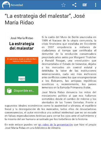 - Mapa de bibliotecas: sistema de geolocalización de las bibliotecas de la RLPE a través de un mapa o listado ordenado por cercanía a la ubicación física del usuario que proporciona acceso a las fichas de todas las bibliotecas, incluyendo los datos de contacto, horarios habituales y especiales, acceso directo al blog y/o web de la biblioteca y poder hacer check-in, votar, añadir comentarios y compartir su información.