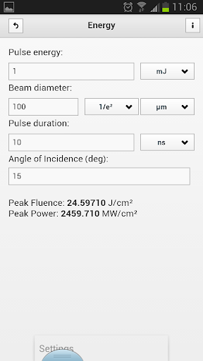 Calculations can be done by providing intuitive parameters such as laser beam diameter, laser pulse energy or average power, wavelength, repetition rate ect. It can save a lot time when adjusting laser systems in front of optical table. Take it and enjoy. Its free!