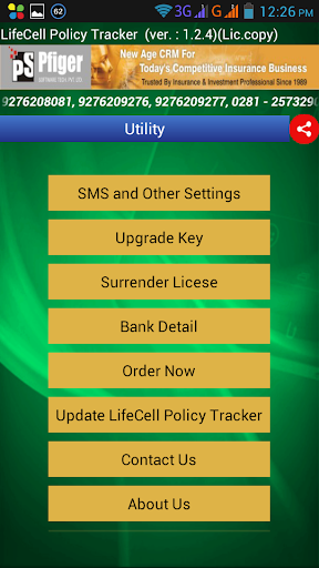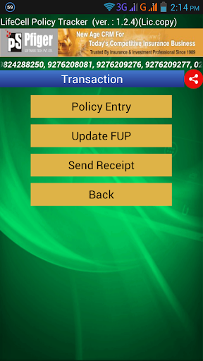 Policy data and get Reminders and Due lists. You can store and view Policy Details in your Mobile like Policy No.,