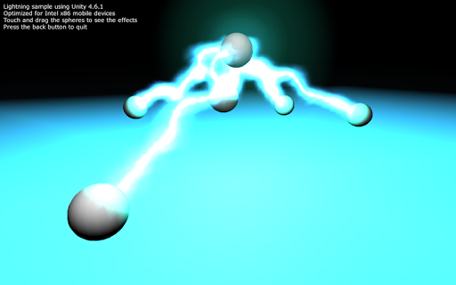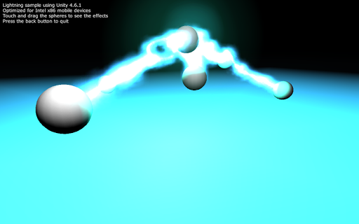 Lightning's simulation using Unity 4.6.1. Optimized for Intel x86 mobile devices. In this application you can play with 6 different spheres. One of them is the target of all the lightnings. Some of them have predefined motions (circular, jumping, etc...). Try to catch one of the spheres to see the effects. Can you catch the one with circular motion?
