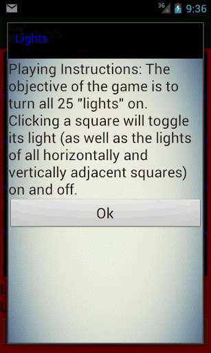 Playing Instructions: The objective of the game is to turn all 25 "lights" on. Clicking a square will toggle its light (as well as the lights of all horizontally and vertically adjacent squares) on and off.