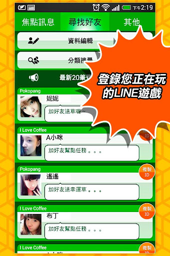 從此,您再也不需打擾到沒玩遊戲的好友,因為,您將擁有一群和您一樣喜愛遊戲的新好友,幫您解任務、在一起養魚、互送幸運草、送愛心…。立刻下載本App,無論哪款遊戲,都找得到朋友一起玩喔~ \(o)/