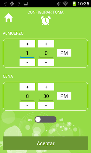 * Alarma diaria como recordatorio de tu toma, antes de cada comida.