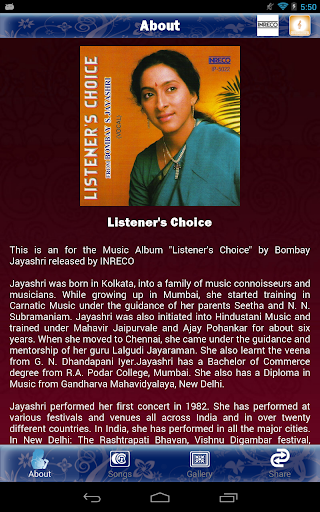 This is the Official App developed by Appytunes Private Limited for the Music Album "Listener's Choice" by Bombay S. Jayashri released by INRECO.