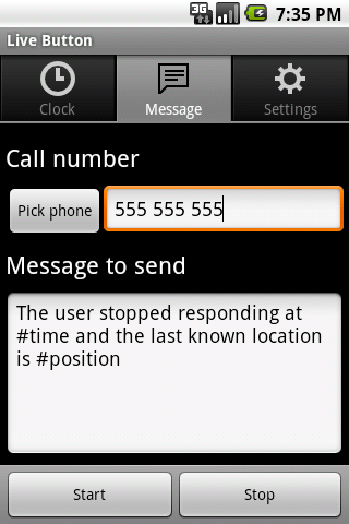 A simple "dead man switch" application. This app will ring an alarm at intervals configured by the user. If the user fails to acknowledge it, it will send a text message to a predefined telephone number containing the location of the mobile and the hour at which the user stopped responding. It can send different messages as the correct location gets progressively refined. This messages *will* cost you money so use with care.