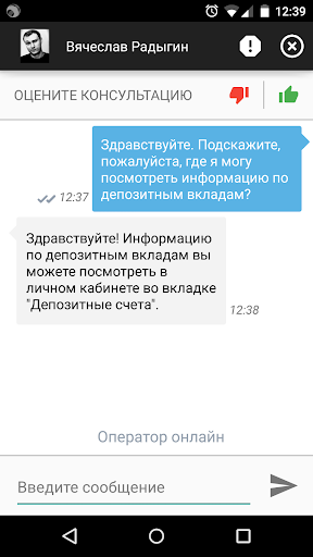 * Ведение переписки с оператором при помощи текстовых сообщений;