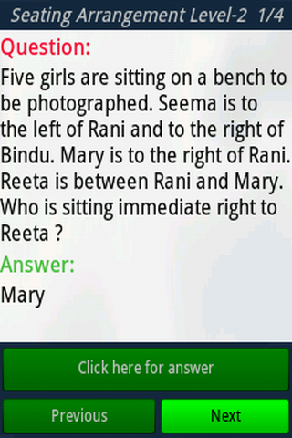 These logical reasoning puzzles will be interesting and improve your mental clarity also.Application will first show the logical reasoning puzzle (problem ) only. Take your time to solve the problem by yourself first. After that you can click on Answer button to see the actual answer.