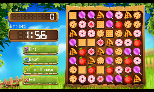 The aim of this logic game is to collect vertically or horizontally 3 equal pieces of candies or cookies. Moving pieces in different directions – left-right and up-down match 3 or more cookies and it will disappear and give you points. The more candies you match in 1 move the more points you will get. You will have 2 minutes to gain maximum points, all the results will be taken to the leaderboard and you can compete with your friends or improve your result.