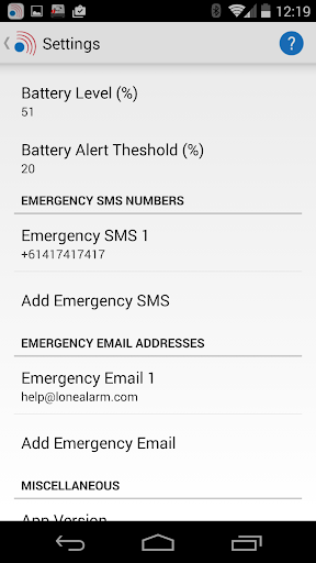 * Low-Battery Warning - Emergency contacts can be alerted automatically when users’ smartphones need re-charging.