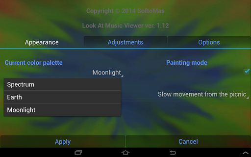 Look at music! When you want have some relax, or make a party, or whatever else! Simply start playing your favorite melodies, and look at them with Look At Music Visualizer!