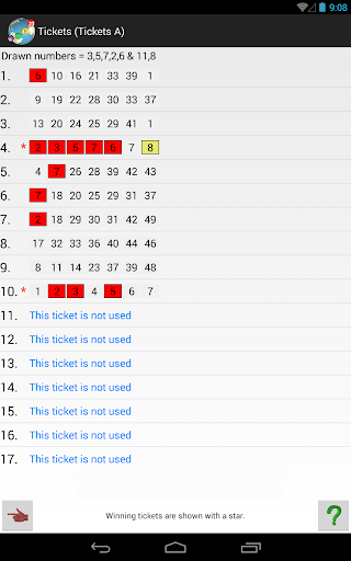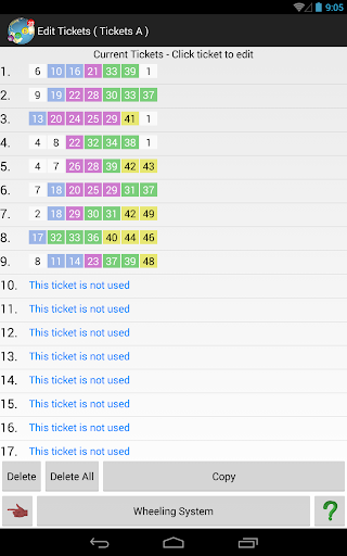 6 different sets of up to 99 tickets can be configured within Lottery Checker, each of which can have a completely different lottery setup if required. Tickets can be created by hand, by using the random function or be created using a wheeling system.