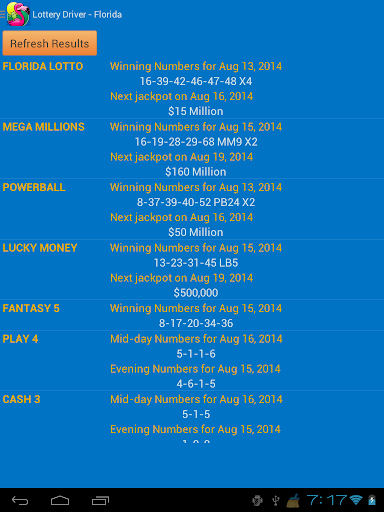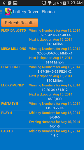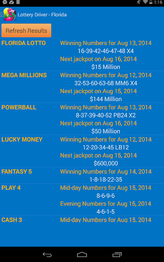 Get results for Florida Lotto, Mega Millions, Powerball, Lucky Money, Fantasy 5, Play 4, and Cash 3.