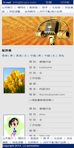 演藝百眼將演藝人資源進行有效整合,類別包括:模特兒、配音員、歌手、化妝師、特色演藝。而且對其進行評估,告知需求客戶演藝人的經驗及能力,也可以實現對演藝人的關注及留言交流,讓客戶對演藝人有更進一步的瞭解。
