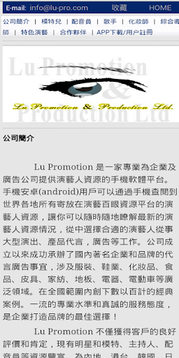 Lu Promotion 是一家專業為企業及廣告公司提供演藝人資源的手機軟體平台。手機安卓(android)用戶可以通過手機查閱到世界各地所有寄放在演藝百眼資源平台的演藝人資源,讓你可以隨時隨地瞭解最新的演藝人資源情況,從中選擇合適的演藝人從事大型演出、產品代言,廣告等工作。公司成立以來成功承辦了國內著名企業和品牌的代言廣告事宜,涉及服裝、鞋業、化妝品、食品、皮具、家紡、地板、電器、電動車等廣泛領域。在全國範圍內創下數以百計的經典案例。一流的專業水準和真誠的服務態度,是企業打造品牌的最佳選擇!
