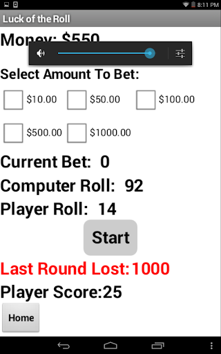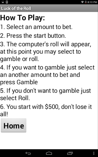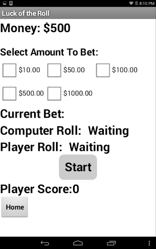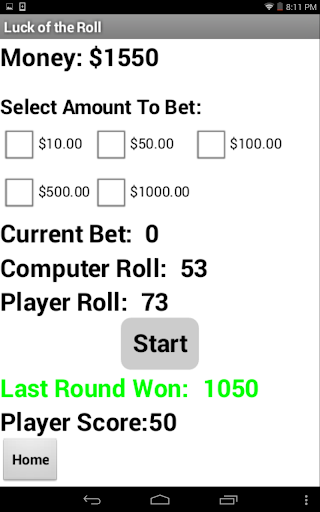 Luck of the Roll is a casino styled game in which players get the opportunity to play against the dealer (in our case the computer) betting on a large dice roll. You place your initial bet tell the dealer to start then go through 1 round of betting in which you can increase your stakes or hold and move to your roll.