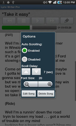 Lyric Writer Pro is an extension of the Lyric Writer app. Lyric Writer Pro was built for musicians who need to have access to their lyrics at a moments notice through either playlists or a master song list. With Lyric Writer Pro it is no longer necessary to carry around bulky notebooks or binders full of lyrics. This app makes storing and organizing your lyrics easy. This app also includes a fully functioning media player so you can play music while viewing the lyrics. Lyric Writer Pro comes with extended features which include auto-scrolling. This allows musicians to keep their focus on the music without having to worry about flipping through pages. Lyric Writer Pro also includes zoom controls and scroll delay options, all of which are auto-saved. This app is great for professional or amateur musicians, karaoke lovers, singer/song writers, or anyone who enjoys singing along to music.
