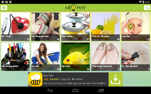 Mỗi ngày đều có những vấn đề nho nhỏ mà chúng ta thường không có nhiều thời gian để giải quyết. Giờ đây, nhờ có internet mà chúng ta được biết thêm rằng trên thế giới, đã có nhiều người tìm ra các mẹo giải quyết cực kì thông minh và đơn giản cho những vấn đề nhỏ đó của chúng ta. Bạn cảm thấy xấu hổ khi cởi một đôi giầy khiến người xung quanh phải bịt mũi ? hay là bạn mong muốn khách mời trầm trồ trước khay trái cây hấp dẫn, ngon miệng, chỉ với vài thao tác đơn giản….Hãy tải ứng dụng “Mẹo Hay” để giải quyết những trợ ngại trong cuộc sống mình một cách thông minh bạn nhé !