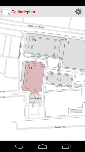 Der Gelände- und Hallenplan schafft eine Übersicht über das gesamte Messegelände aus der Vogelperspektive. Er lässt sich mit den Fingern auf dem Touchscreen stufenlos vergrößern und verkleinern. Per Klick auf eine Halle kann eine Hallenebene ausgewählt werden die dann sämtliche Stände in der Halle auf den Bildschirm bringt. Ein weiterer Klick auf einen Messestand bringt den Aussteller mit Namen, Logo und Standnummer ins Blickfeld. Im nächsten Schritt wird in dann das Ausstellerdetail in der Ausstellersuche geöffnet, in dem man Kontaktdaten und Produkte der Firma einsehen kann. So kann auch schnell und einfach zwischen Ausstellersuche und Geländeplan gewechselt werden, da beide eng miteinander verbunden sind. Auch die eigene Position kann mittels GPS dargestellt werden. So kann jeder Besucher leicht auf dem Bildschirm überprüfen, ob die Halle richtig ist und in welche Richtung der nächste Gesprächspartner liegt.