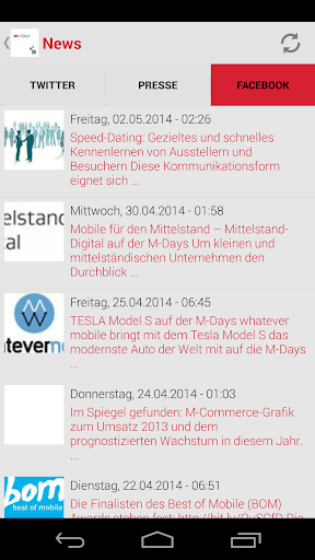 Dank News und Twitter bleiben Fachbesucher und Journalisten auf dem aktuellen Stand. Hier können alle aktuellen Pressemitteilungen und die Social Media Nachrichten aus Twitter zur M-Days ohne weitere Einstellungen direkt eingesehen werden. Die Nachrichten aktualisieren sich in Echtzeit und können schnell und übersichtlich eingesehen werden. Per Klick kann bei einer Pressemitteilung auf die Website der M-Days gewechselt werden, auf der der gesamte Text zur Verfügung steht.