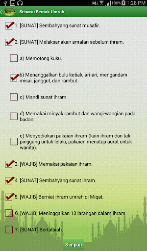Selain itu, terdapat juga senarai semak umrah bagi memudahkan jemaah menyemak aktiviti umrah mereka. Segala maklum balas daripada pengguna adalah amat berguna kepada kami untuk memperbaiki kelemahan dan meningkatkan lagi kualiti aplikasi ini.