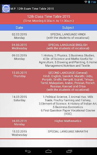 This Application Provides Time Table of Madhya Pradesh 12th class exam 2015