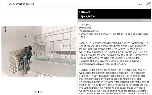 Descarrega i experimenta una visita diferent al Museu amb la nostra aplicació de realitat augmentada. I torna a visitar-nos per descobrir nous elements amb cada actualització. L'aplicació inclou informació bàsica d'accés al museu, les exposicions, l'agenda d'activitats i informació multimèdia sobre algunes obres de la Col·lecció MACBA.