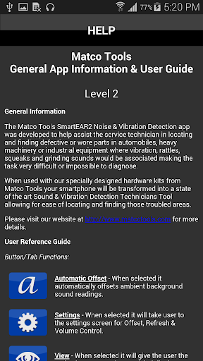 The MATCO TOOLS SmartEAR2 Noise & Vibration Detection app was developed to help assist the service technician in locating and finding defective or worn parts in automobiles, heavy machinery or industrial equipment where vibration, rattles, squeaks and grinding sounds would be associated making the task very difficult or impossible to diagnose.